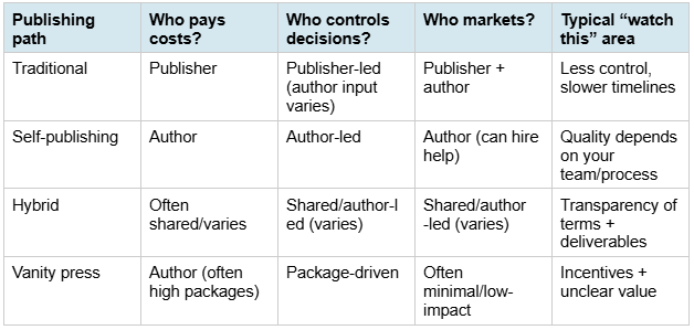 If you’re still sorting out what counts as traditional, self, hybrid, or vanity, this overview can help you quickly map the landscape: Types of Publishing Paths.
